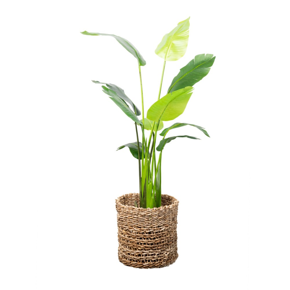 No incluye el cesto de seagrass. La planta viene con una maceta redonda negra.